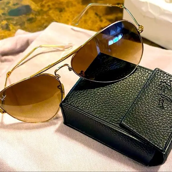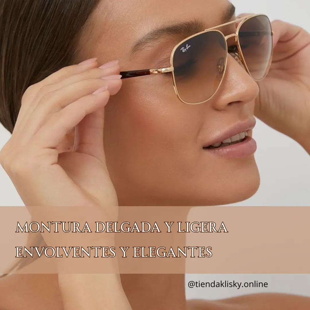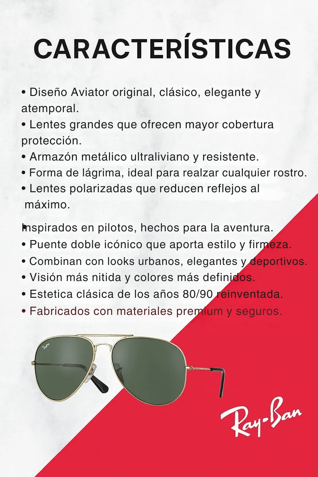 Los Ray-Ban Aviator destacan por su icónica forma en lágrima, cristales amplios y curvados que ofrecen una mirada moderna y segura. Su montura metálica ultraliviana, el doble puente clásico y las varillas finas aportan elegancia y comodidad en todo momento. Incluyen almohadillas nasales regulables y lentes disponibles en tonos tradicionales y espejados, logrando ese estilo inconfundible que nunca pasa de moda.