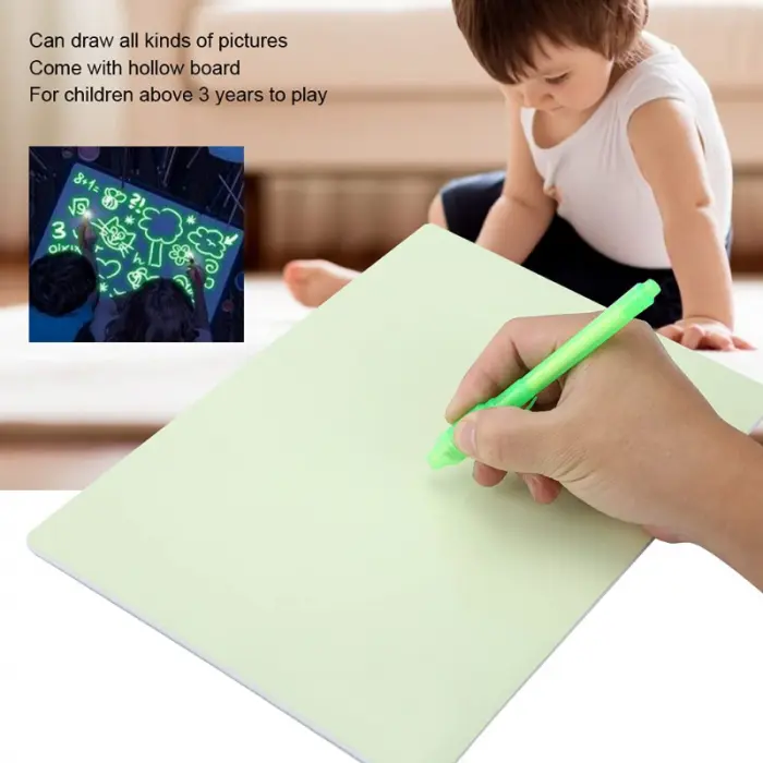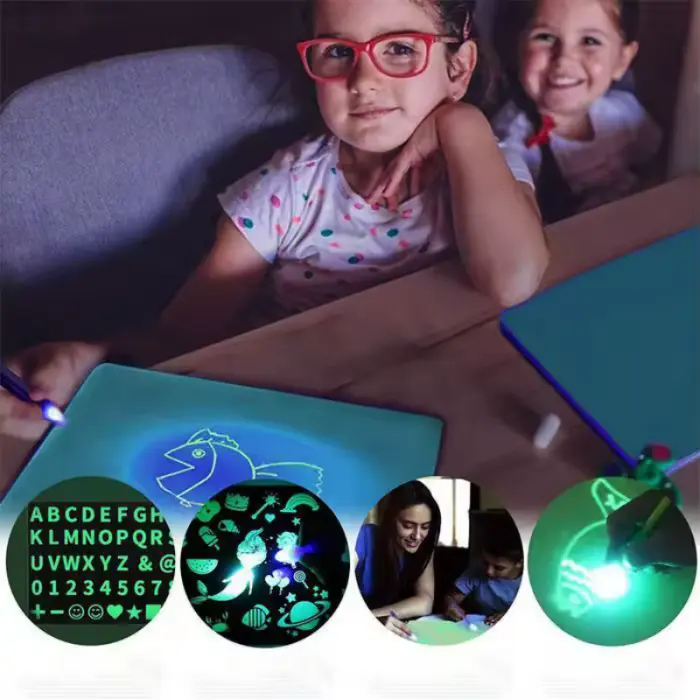 Pizarra lumínicaTamaño A4Incluye: pizarra, bolígrafo lumínico, tarjeta con letras